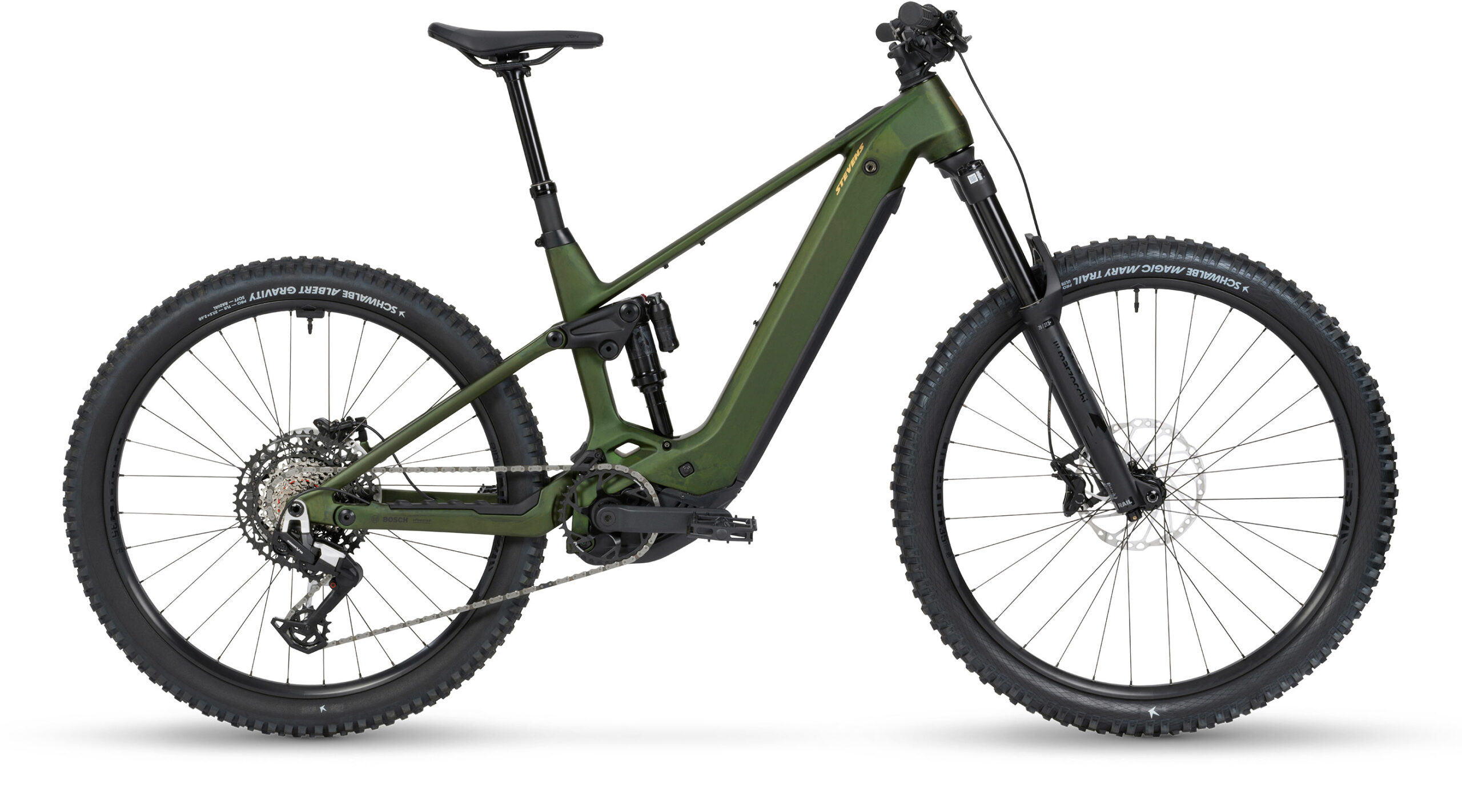 Řazení je řešeno bezdrátovou sadou SRAM Eagle 90 Transmission (1×12) s kazetou 10–52 zubů, která zajišťuje široký rozsah a precizní přenos síly. Kola Sun Ringlé Düroc TR35 spolu s oblíbenou kombinací plášťů Schwalbe Magic Mary a Albert (29″/27,5″) poskytují skvělou trakci, jistotu v zatáčkách i odolnost vůči průrazům.